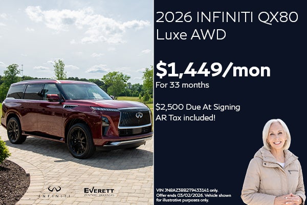 Well-qualified lessees lease a new 2026 QX80 Luxe AWD in retailer stock for $1,449/Month for 33 months. Excludes taxes, title, and license fees. $2,500 due at lease signing (includes $1,051 down payment and $1,449 first month's payment). Offer valid only when financed through INFINITI Financial Services. Subject to residency restrictions. $98,575 MSRP includes destination and handling charge. Net capitalized cost of $92,845 includes a $795 non-refundable acquisition fee. Retailer contribution may affect actual price set by retailer. Monthly payments total $47,817 at lease end, purchase for $58,159, plus purchase option fee up to $300 (except KS & WI), plus tax, or pay excess wear & use plus $0.25 per mile for mileage over 10,000 miles per year. Disposition fee due at lease end. No security deposit required. Must take delivery from new retailer stock. Ends 03/02/2026.