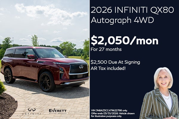 Well-qualified lessees lease a new 2026 QX80 Autograph 4WD in retailer stock for $2,050/Month for 27 months. Excludes taxes, title, and license fees. $2,500 due at lease signing (includes $450 down payment and $2,050 first month's payment). Offer valid only when financed through INFINITI Financial Services. Subject to residency restrictions. $116,560 MSRP includes destination and handling charge. Net capitalized cost of $109,645 includes a $795 non-refundable acquisition fee. Retailer contribution may affect actual price set by retailer. Monthly payments total $55,350 at lease end, purchase for $71,284, plus purchase option fee up to $300 (except KS & WI), plus tax, or pay excess wear & use plus $0.25 per mile for mileage over 10,000 miles per year. Disposition fee due at lease end. No security deposit required. Must take delivery from new retailer stock. Ends 03/31/2026.