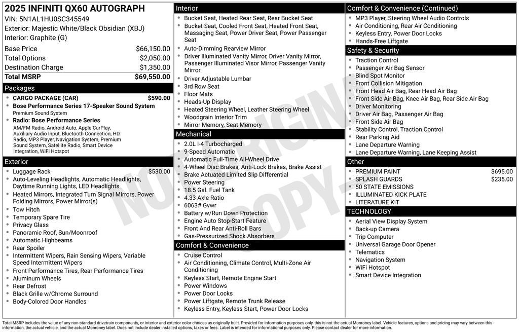 As an INFINITI Certified Pre-Owned vehicle, this QX60 Autograph has undergone a rigorous 167-point inspection and comes with a comprehensive warranty and Roadside Assistance program. The $0 deductible, transferable warranty, and 1-year prepaid service visit further demonstrate INFINITI's commitment to your satisfaction and long-term ownership experience.
