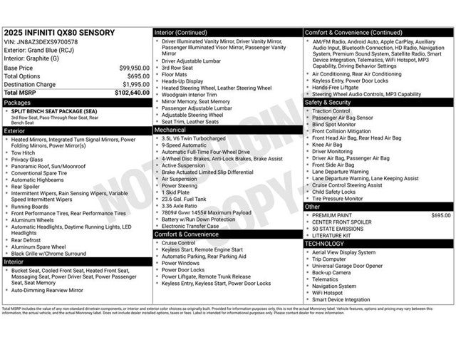 Indulge in the unparalleled refinement and capability of this stunning 2025 INFINITI QX80 SENSORY. With its striking Blue exterior, this SUV commands attention wherever it goes. Powered by a robust 3.5L V6 DOHC 24V engine paired with a smooth 9-Speed Automatic transmission and 4WD, this QX80 delivers an exceptional driving experience with impressive fuel efficiency of 16 city/19 highway MPG.