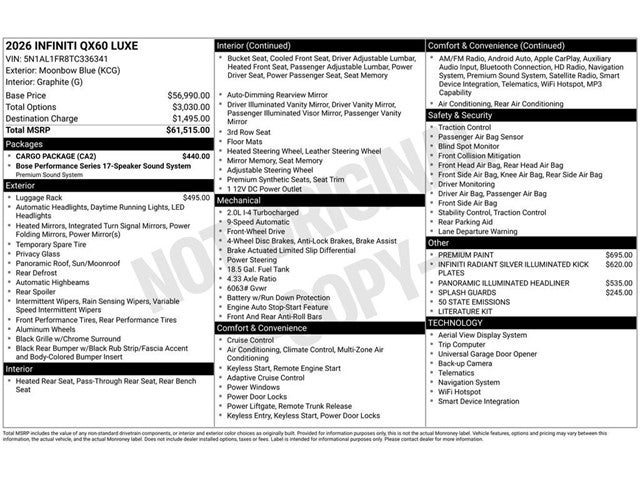 • PREMIUM PAINT, INFINITI RADIANT SILVER ILLUMINATED KICK PLATES, PANORAMIC ILLUMINATED HEADLINER, SILVER ROOF RAIL CROSSBARS, CARGO PACKAGE, SPLASH GUARDS